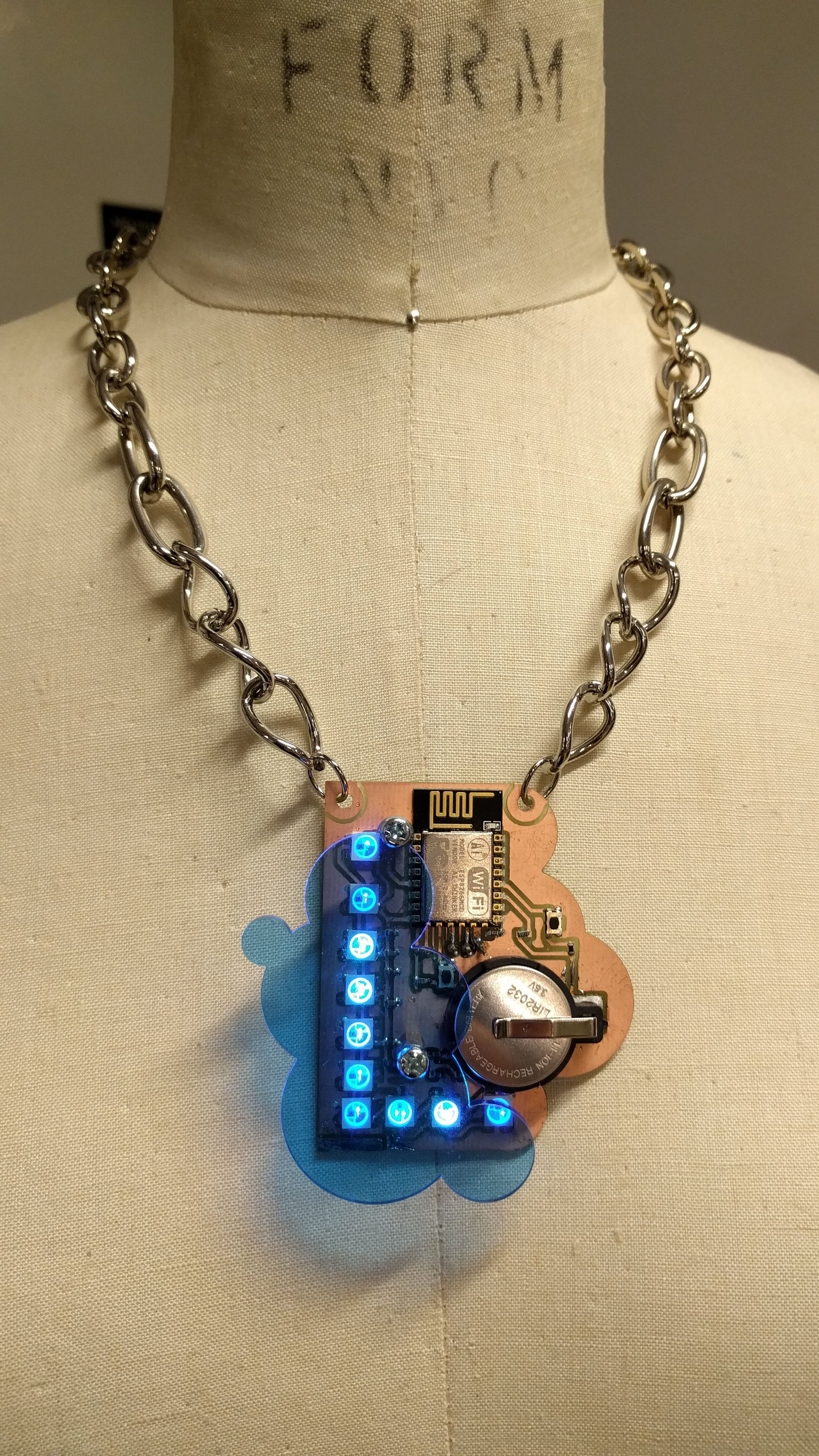 An electronic amulet that receives power through the internet. This concept is inspired by the supportive comments often left on personal instagram posts by people that have often never met in person or are physically distant. In a way, through our connections on social media, we can give each other protection and support. The lighting pattern on the LEDs change based on likes and comments on the users instagram posts.