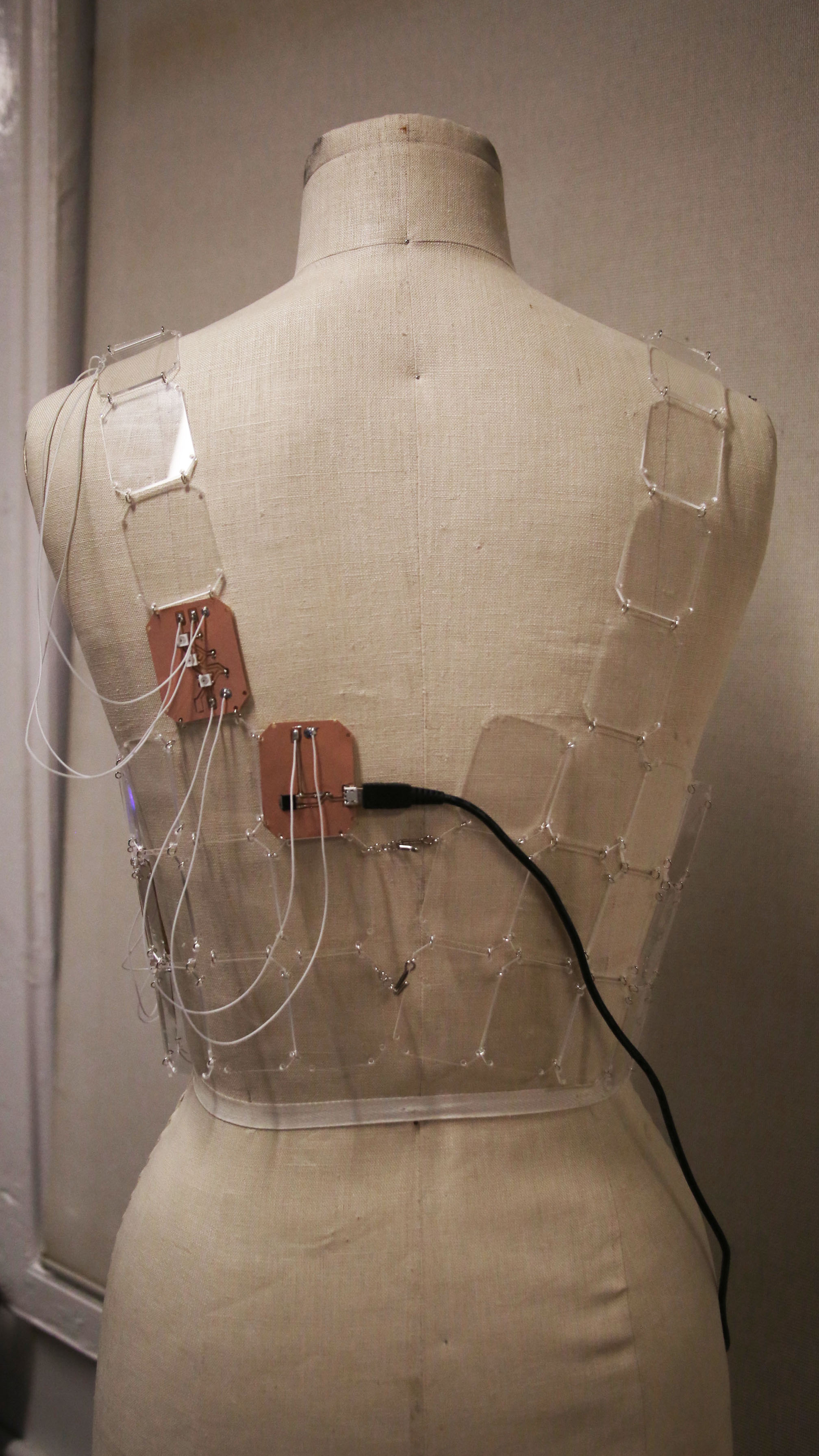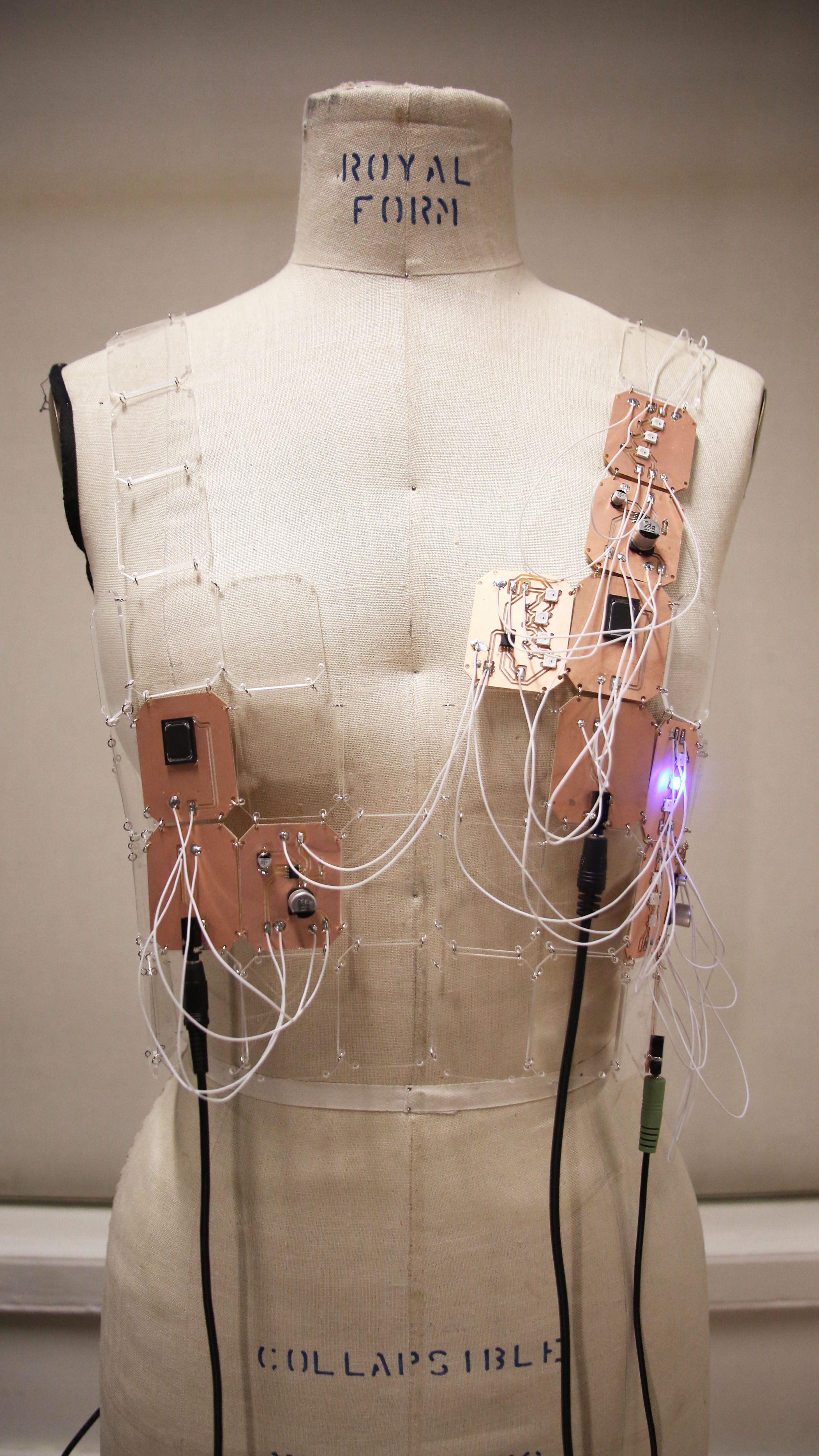 Part one of ITP thesis where the artist is examining the blurry line between “person” and “thing” by positioning herself as a cyborg making cyborgs. Person Thing #1 is a garment constructed of acrylic and printed circuit boards or pcbs with speakers and colored leds. The speakers are fed audio through aux cord inputs connected to mobile devices playing different videos. The speakers’ audio blend together, conceptually imbuing the skin with media.